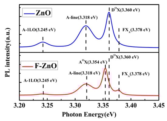 In order to further analyze the relationship between the defects and photoluminescence of fluoride ions passivated ZnO films, a low-temperature PL test was performed. The low temperature (86K) PL spectra of ZnO films is shown in Figure 5. The luminescence at 3.378 eV is the radiative recombination of free exciton A (FXA); the luminescence at 3.360 eV is the transition of shallow donor-bound exciton (DOX) to the valence band []. The DOX intensity is dominant for the non-passivation samples, indicating that the ZnO donors are dominant and the conductive type is n-type. The luminescence peak at 3.318 eV is a complex composite peak with A-line luminescence []. This can be caused by some possible transitions, including the transition of excitons bound by neutral impurities, the transition of excitons bound by surface states or defect states, the two-electron transitions of excitons bound by neutral donors, and the donor-acceptor composite transitions [,]. The luminescence peak at 3.245 eV is the 1-LO phonon replicas of the A-line emission, and it is 70 meV lower than the A-line peak, which is consistent with the ZnO exciton binding energy.