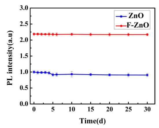 The PL stability of ZnO films were tested for a period of 30 days in air, as shown in Figure 6. It has been found that the PL intensity of ZnO films without passivation has a slight decrease, while a nearly unchanged PL intensity is measured for ZnO films by fluoride plasma passivation.