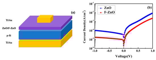 The electrical properties of ZnO films were analyzed by the current–voltage measurement of the ZnO/p-Si heterojunction diodes. The schematic device structure is shown in Figure 7a, and current density (J) voltage (V) curve is shown in Figure 7b. It can be seen from Figure 7b that the non-passivated device shows high current density, which may be caused by interface trap-assisted tunneling [] of carriers, and the interface state. Furthermore, the defects in ZnO films can also diminish the conduction band offset between ZnO and p-Si substrates and cause an increase in current density in advance. By SF6 plasma passivation, the reverse current density decreases from 1.07 × 10−4 A/cm2 to 1.77 × 10−5 A/cm2 at −1V bias, indicating that the heterojunction diode after passivation has a high-quality interface and a low defect density in ZnO, the trap assisting the tunneling of carriers [,] can be effectively restrained.