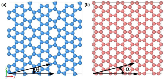 The model of PSI-graphene and graphene is shown in Figure 1. The PSI-graphene structure was constructed from pentagonal, hexagonal and heptagon carbon rings [28], which was dynamically and thermally stable, calculated by state-of-the-art first-principles. Figure 1 illustrated that the PSI-graphene and graphene sheets were stretched along different directions in the x-y plane. θ was the shifting angle away from the symmetry axis and α was the shifting angle away from the armchair direction. Graphene was a six-fold rotational symmetry structure. The angle of the armchair and zigzag direction is 30°. The shifting angles of graphene between 0° and 30° were selected. Other shifting angles were obtained by the symmetry of a graphene sheet. The PSI-graphene sheet was axisymmetric structure, and the shifting angle was selected between 0° and 180°.