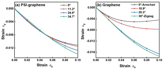 The curves of strain εx vs εy for two structures on the stretching direction at 300 K. (a) PSI-graphene (b) graphene.