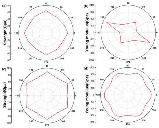 The polar coordinate curve of (a) ultimate strength and (b) the Young’s modulus of PSI-graphene and (c) ultimate strength and (d) the Young’s modulus [36] of graphene with different stretching directions at 300K.