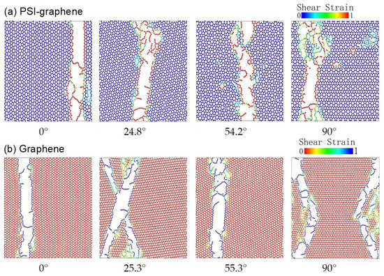 In this section, compared with graphene, the fractured state of PSI-graphene was studied. Here, the von Mises strains (scales from 0 to 1) has been employed to study the local atomic strains by using OVITO with a cutoff radius of 3.5 Å. The von Mises strain is based on the distortion energy of a structure and is widely used in biomechanical studies [37]. Figure 4 exhibited the evolution of local shear strains for loading along stretching direction. Figure 4a illustrated the failure morphology of PSI-graphene at different shifting angles when the crack surface was generated. With θ = 0°, 24.8°, 54.2° and 90°, crack surfaces in the x-y plane was a straight line, which was substantially perpendicular to the direction of stretching.