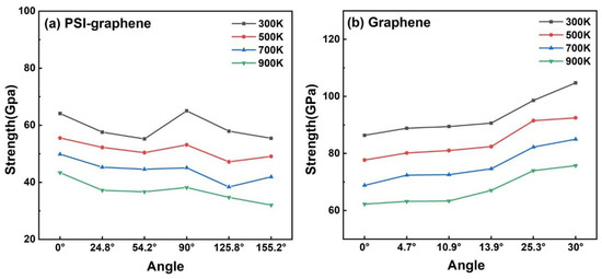It can be observed from Figure 5a that when the temperature was changed from 300 K to 900 K, the ultimate strength gradually reduced. At 300K, the ultimate strength value was in the range of 55 to 65 GPa, while at 900 K the ultimate strength value was in the range of 32 to 43 GPa. The strength decreased by ~40% at various angles. It can be found from Figure 5a that the ultimate strength in the 0° and 90° directions was greater than the other directions at the same temperature. This result was in perfect harmony with the above studies. Figure 5b showed the curves of ultimate strength of graphene sheets at different temperatures and angles. The ultimate strength gradually increased and reached a maximum at 30°. From 300 K to 900 K, the ultimate strength of the armchair (0°) direction was 86 GPa, 78 GPa, 69 GPa and 62 GPa, while the zigzag directions (30°) were 105 GPa, 93 GPa, 85 GPa and 76 GPa, respectively. Besides, at the direction of armchair (0°) and zigzag (30°), the ultimate strength increased by 38.7% and 38.8% respectively. As the temperature increased, the ultimate strength of the material decreased and the mechanical properties of the PSI-graphene deteriorate.