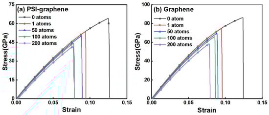 The stress-strain curve of PSI-graphene with vacancy defects is shown in Figure 6a. It can be inferred from the graph that the ultimate strength of PSI-graphene decreased with the increase of the number of absent atoms inside the structure. When the PSI-graphene sheet had no points missing, the ultimate strength of the structure was 64 GPa. When the PSI-graphene sheet was missing 1, 50, 100 and 200 atoms, the ultimate strengths were 54 GPa, 50 GPa, 44 GPa, 42 GPa, the ultimate strength was reduced by about 16%, 22%, 31% and 35%, respectively. Figure 6b shows the stress-strain curves of graphene with different point defects. It can be found that when the graphene sheet had no point defects, the ultimate strength was 86 GPa. When the graphene sheet was removed 1, 50, 100 and 200 atoms, the ultimate strengths were 75 GPa, 70 GPa, 66 GPa and 59 GPa, and the rates of decline were 13%, 19%, 23% and 31%, respectively. In summary, the presence of vacancy defects could impair the tensile strength of the PSI-graphene and graphene sheets.