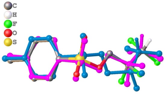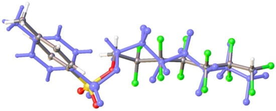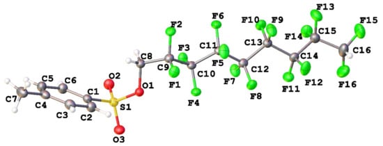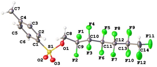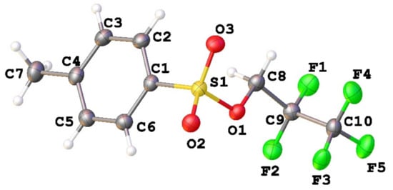 General views of molecules 1–4 are presented at Figure 1, Figure 2, Figure 3, Figure 4, Figure 5 and Figure 6, while the information about the most important structural parameters is summarized in Table 1 (in addition, molecular structures of 2b and 3b are shown at Figures S1 and S2 in supplementary). All compounds crystallized in monoclinic cell. Asymmetric unit of 2b contains two molecules denoted as A and B. Other structures are characterized by Z = 1. Bond lengths in tosylate and fluoroalkyl moieties are the same as in the case of similar sulfonates and fluorinated alcohol derivatives in CSD [34]. The length of the terminal C–F and C-C bonds is a bit shorter than in the case of difluoromethylene moieties vicinal to sulfonate ones.