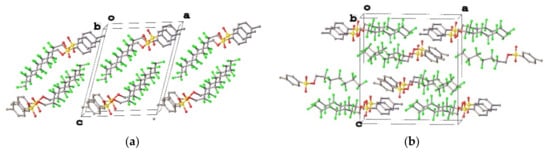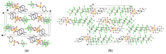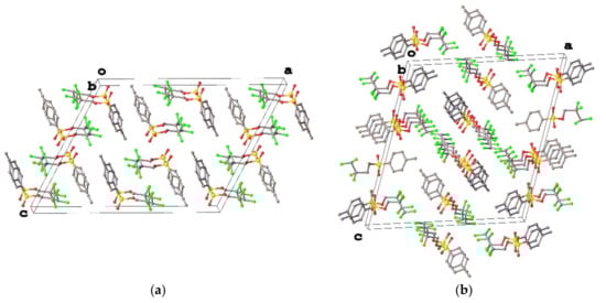 Compounds 1–4 form similar crystal packing, which can be described as a tail-to-tail arrangement of molecules (Figure 7, Figure 8 and Figure 9). It is noteworthy that the values of b side in 1–4 are always equal. Besides, the fluoroalkyl fragments are assembled together, however, there are differences in mutual disposition of molecules in crystal packing. Analysis of short contacts between atoms of these fragments in 1 (Figure 7a) revealed the absence of F…F contacts (all F…F distances exceed the sum of those van-der-Waals radii that is equal to 2.9 Å [35]). The most pronounced intermolecular interactions are weak C–H…O hydrogen bonds and C–H…π interactions between tosylate moieties. In the case of bulky fluoroalkyl fragments (2–4), the F…F distances became shorter. In several cases these distances are considerably shorter than 2.9 Å (for instance, F3…F8[1 − x, −1/2 + Y, 1 − Z] and F7…F5[x, −1 + y, z] distances in 3a and 4 are equal to 2.764(4) and 2.5112(17) Å, respectively). Additional characterization of F…F contacts using pair C–F…F–C angles has shown that first angle is close to linear (142–170°), while the second one varies in wide range (106–161°). Generally, the shorter F…F distance the closer both angles are to 180° that corresponds to halogen-halogen contact of type I according to classification by Desiraju [36]. According to CSD [34], this picture is typical for compounds with polyfluoroalkyl fragments.