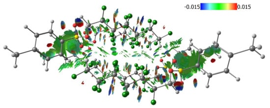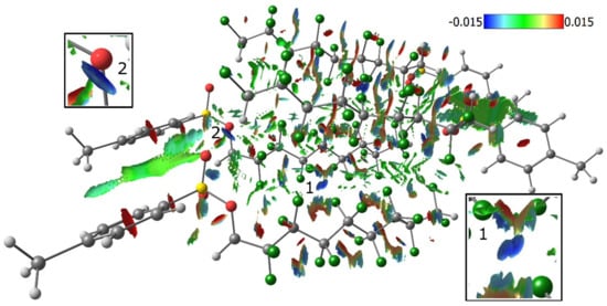 Since a lot of F…F interactions were found in 1–4 it is important to analyze these interactions using NCI to find similarities and differences between weakest and strongest ones related to their nature. It is clear (Figure 9, Figure 10 and Figure 11) that strongest intra- and intermolecular F…F interactions are characterized by negative values of λ2 similarly to hydrogen bond C-H…O between sulfonate group and terminal CHF2 group. These regions are highlighted by blue or light blue color on Figure 10, Figure 11 and Figure 12. Thus, F…F interactions shown in Table 2 can be described as mostly attractive ones. At the same time, the values of signλ2rho for the majority of intermolecular F…F interactions are close to zero and the sign of λ2 varied from positive to negative (green color on Figure 10, Figure 11 and Figure 12), so it is very difficult to unambiguously describe them as attractive or repulsive.