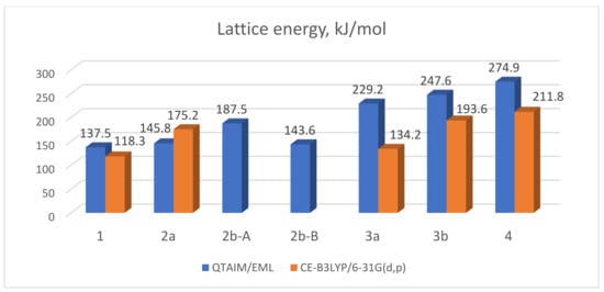 The information about lattice energies estimated from QTAIM/EML method and CE-B3LYP/6-31G(d,p) calculations is presented in Figure 12 and Figure 13.