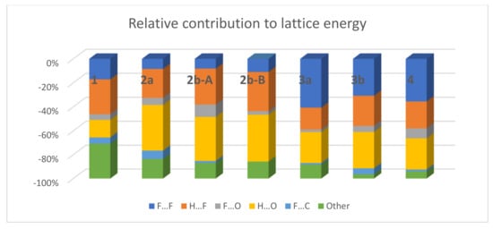 It can be seen from Figure 13 that QTAIM/EML overestimated the lattice energy in all structures except for 2a. Nevertheless, both methods predicted that polymorph 3b is more stable than 3a. This result was also verified by comparison of total energies of 3a and 3b (total energy of the latter divided by Z is 2.47 kJ/mol larger than the former). The situation with polymorphs 2a and 2b is the same as in 3a and 3b. Molecules A and B have noticeably different values of lattice energy. If averaged value of lattice energies of molecules A and B (165.6 kJ/mol) was taken as measure of stability, then 2b is appeared to be more stable than 2a. The comparison of the total energies of 2a and 2b divided by Z also supports this conclusion (the difference is 1.35 kJ/mol). Total contributions related to the most prominent intermolecular interactions are shown at Figure 14. It is logically to assume that contribution of F…F interactions to lattice energy will increase along the amount of fluorine atoms, while the contribution of H…O interactions (namely C-H…O hydrogen bonds) will decrease. At first glance, the results of QTAIM/EML evaluations agree with this assumption but there are two exceptions. The first one is related to polymorphism, because the contribution of F…F interactions can vary due to way of molecular packing. The part related to F…F in 3a exceeds that in 3b, although, their absolute values are almost equal (78.4 and 76.2 kJ/mol). At the same time, the percentage of H…O interactions in 3a is less than in 3b. It is necessary to remind that polymorph 3b is more stable than 3a. Again, the situation with polymorphs 2a and 2b is the same. The contribution of F…F interactions to lattice energy in 2b is larger than in 2a. At the same time, the percentage of H…O and H…F interactions in 2b is considerably larger than in 2a case. Thus, H…O interactions can be the main factor that made polymorphs 2b and 3b more favorable than 3a and 3a ones. This conclusion is in agreement with recent paper by Saha [46]. The second exception is related to contribution of O…H interactions in the case of 1. There is no terminal CHF2 group in molecule of PhO2SOC2F5, so this group cannot participate in C–H…O bonds with phenyl group that explain so low contribution of H…O interactions. Various interactions formed by hydrogen atoms (C–H…π, H…H, H…C, denoted as “other” on Figure 14) are responsible for more than 30% of lattice energy in 1.