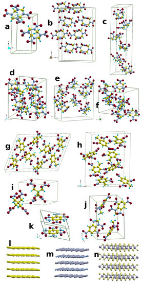 Semihard materials. The primitive unit cell of (a) -HMX, (b) -HMX, (c) -HMX, (d) -RDX, (e) -RDX, (f) -RDX, (g) -TNT, (h) -TNT, (i) PETN, (j) Tetryl, and (k) TATB. The layer materials are (l) Graphite, (m) h-BN, and (n) MoS.