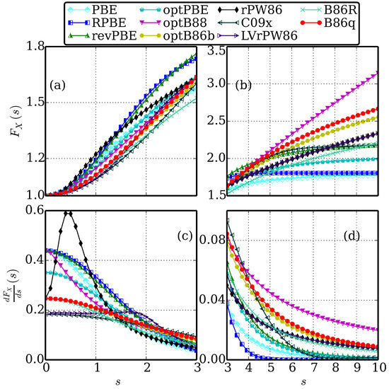 with . This property plays an important role in predicting equilibrium geometries for solids and surfaces [44]. This constraint has been applied in other exchange functionals [18,20,45]. It is worth pointing out that C09 employs . Second, at large gradient limit, it proposed that should have dependence so that it can avoid the spurious binding from exchange only. So far only Perdew and Wang (PW86) [46] and Becke (B86b) [47] exchange functionals fulfill this reqirement [45].