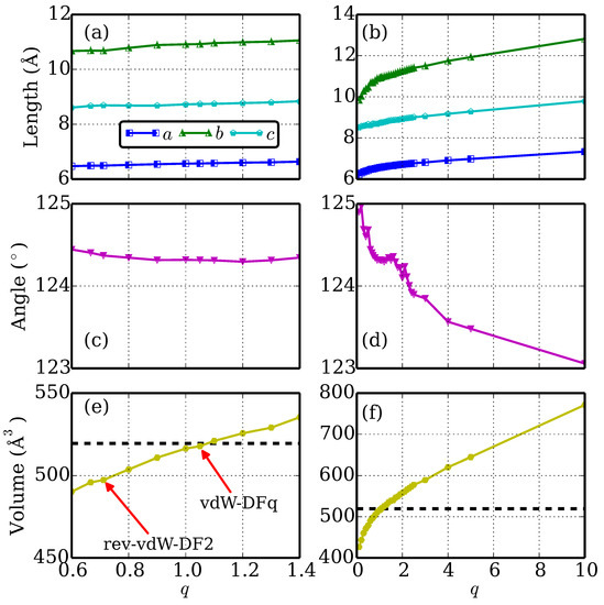 It is seen from Figure 4 that the lattice constants, lattice angle, and the volume can be tuned continuously at a very large range. For example, the volume varies from 82% to 200% when q changed from 0.1 to 100.0. Within the vicinity of the , the volume varies linearly with respect to q. gives the best match to the experimental volume with RSD of −0.16%. As a comparison, the rev-vdW-DF2 method [18], the latest vdW-DF series method, predicted the volume as 496.905 Å, 4.2% smaller than the experiment, which falls out of the satisfactory scope of 3%. At large deviation from 1.0, the relationship between the volume and the variable q is nonlinear as expected.
