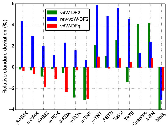 Relative standard derivative of the predicted mass density of the semihard materials. The mass density RSD referring to the experiments using vdW-DF2, rev-vdW-DF2, and vdW-DFq method for 11 common energetic materials molecular crystals and 3 typical layered van der Waals crystals.