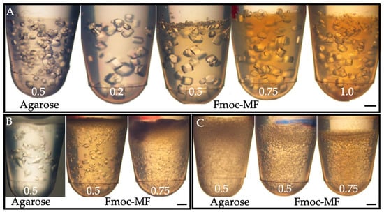 Fmoc-MF and Fmoc-Y hydrogels were tested as media for protein crystallization with the model proteins lysozyme, glucose isomerase, and thaumatin, using the two-layer configuration of the counter-diffusion technique. Crystals of the three model proteins were obtained using Fmoc-MF hydrogels (Figure 1). Although the comparison of nucleation density has to be done with care when using counter-diffusion techniques, due to the evolution of the supersaturation within the length of the experiment, we observed that in the case of lysozyme, the number of crystals at low gel concentration, for instance 0.2% (w/v), was lower than the experiment done in agarose at 0.5% (w/v). This result can be explained by the well-known capability of agarose hydrogel to induce the nucleation of lysozyme [26]. It is also observed from Figure 1A that the number of crystals increased with the increasing Fmoc-MF, reaching agarose nucleation density when the concentration was 1.0% (w/v). Contrarily, thaumatin showed a much higher nucleation density in Fmoc-MF at any concentration than the reference experiment in agarose. As the records on the effect of agarose on the nucleation of thaumatin are not available, we cannot attribute this enhancement of nucleation to the Fmoc-MF hydrogel; it could also be an inhibition effect of agarose over the nucleation of thaumatin. In the case of glucose isomerase, there was some enhanced nucleation density in the experiments with agarose when compared to those run in Fmoc-MF, regardless of the concentration of the hydrogel. Overall, the effect could be the promotion of nucleation induced by agarose fibers or an inhibition effect of the Fmoc-MF hydrogel.
