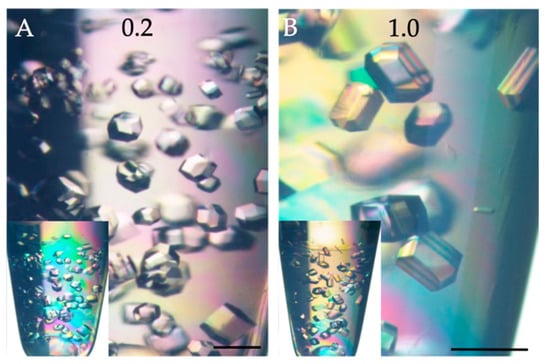 Lysozyme crystal grown in 0.2% w/v (A) and 1.0% w/v (B) Fmoc-Y hydrogels by the 2-L counter-diffusion technique. Inserts in the lower-left part of A and B show the whole experiment. Scale bars correspond to 1.0 mm.