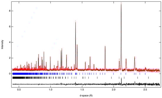 Fit to neutron data for Al10O14(OH)2; observed and calculated data are red crosses and the continuous black line, respectively. The dotted blue and solid black curves represent the background and the difference between observed and calculated data, respectively. The vertical blue and black lines mark the positions of Bragg reflections from the Al10O14(OH)2 (akdalaite) and Al2O3 (corundum), respectively.