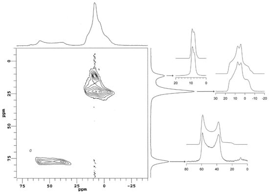 The 1H NMR spectrum consists primarily of a single, narrow central peak at +8.6 ppm, with two spinning sidebands, as shown in Figure 4. A small shoulder near +6.5 ppm (<5% intensity) likely arises from an impurity phase and/or surface adsorbed water. The single, well-resolved central peak indicates a single H site, and the small peak width (600 Hz) observed at this modest spinning rate (15 kHz) indicates a small homonuclear dipolar coupling characteristic of low hydrogen density [35,36]. In this chemical shift range, the literature data for 1H indicate a good linear correlation with d(O…O) hydrogen bond lengths [35], although the relationship between chemical shift and hydrogen bond distance can also be expected to reflect other geometrical factors such as H–O distance and O–H…O angle. With that caveat, the observed shift at 8.6 ppm (Figure 4) is similar to that of diaspore (α-AlOOH), which has a shift at +9.4 ppm and an O···O distance of ~2.65 Å [35] compared with an O…O distance of ~2.91 Å in akdalaite.