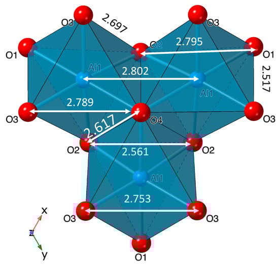 In addition, for any nonideality in bond valence sum, some of the Al bonding environments in akdalaite have characteristics that are similar to those observed in the ferrihydrite model. In analyzing the Al–Al distances (Table A10, Figure 5), it is clear they are nonideal. The Al1–Al1 bond distance between the edge sharing octahedra is 2.802 Å, much shorter than the other edge sharing octahedra where the Al1–Al2 distance is 3.018 Å (Table A10). The short edge sharing distance between Al1–Al1 is close to that of the Al octahedral face sharing distance of corundum at 2.654 Å and is ~9% shorter than the other edge sharing Al1–Al2 distance, 3.339 Å (Table A4, Figure 5). In ferrihydrite, the Fe1–Fe1 bond distance is 2.907 Å, which is ~11% shorter than the other shared edge Fe1–Fe2 bond distance of 3.261 Å, much like the Al sites in akdalaite. However, this Fe1–Fe1 edge sharing distance is only slightly larger than the Fe octahedra face sharing distance in hematite (2.895 Å) [20,41].