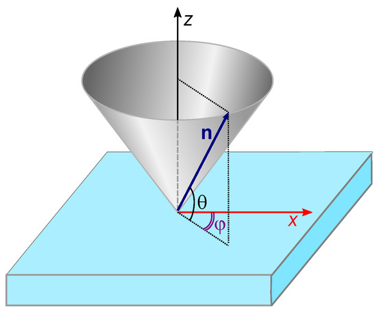 Scheme of conical surface anchoring of director n with the substrate. and are the tilt and azimuthal angles, respectively.