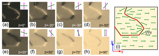 POM photos of sample area presented in Figure 2. The polarizer is perpendicular to the rubbing direction of PVA film. The angle between the analyzer and rubbing direction is 0 (a), −20 (b), −30 (c), −50 (d), 20 (e), 50 (f), 70 (g), 90 (h). Corresponding scheme of director orientation at the top substrate covered with PiBMA (i). The POM photos show 380 × 380 m area. The domain wall is indicated by the red line. The angle is an azimuthal angle of director at the top substrate.