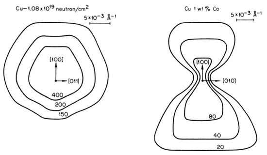 Figure 3. Because the dislocation loops populate all {111} type planes in the neutron-irradiated sample, they produce diffuse intensity in all directions due to the anisotropic displacements directed largely normal to all <111> directions. On the other hand, for the spherical Co precipitates, there is a minimum in the Huang scattering perpendicular to the (200) reciprocal lattice vector, which indicates the spherical symmetry of the displacement field surrounding cobalt precipitates. X-ray scattering investigations of precipitates is addressed in detail in