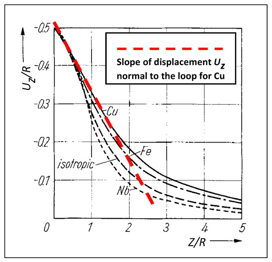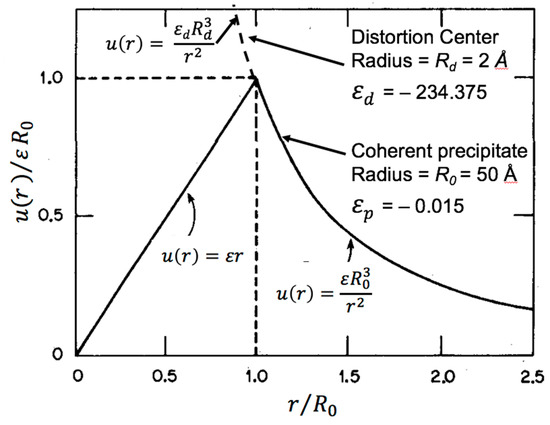 R0) spherical precipitate in an elastically isotropic material has a relatively simple form with linearly increasing displacements inside the precipitate and quadratically decreasing displacements outside the precipitate. The dashed upward curving line in