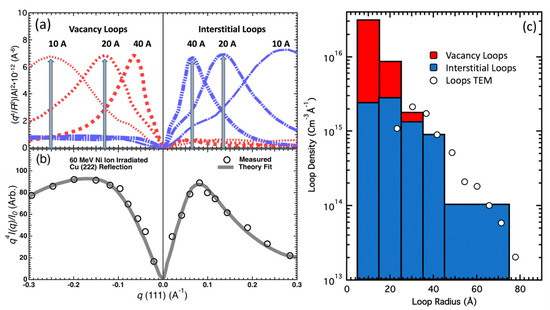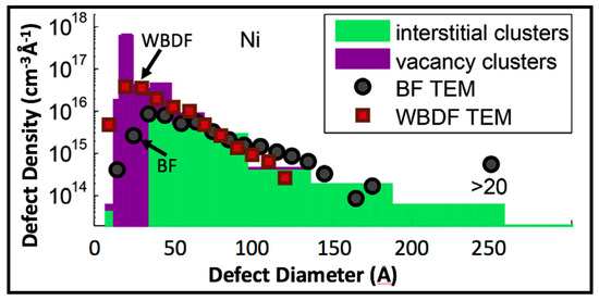 33] made use of MD atomic modeling displacement simulations to calculate stacking fault tetrahedra diffuse scattering cross-sections in a study of Ni-ion-irradiated Ni and NiCo single crystals. High-resolution TEM imaging showed that stacking fault tetrahedra were present, but no vacancy loops were observed; thus, Olsen et al. [