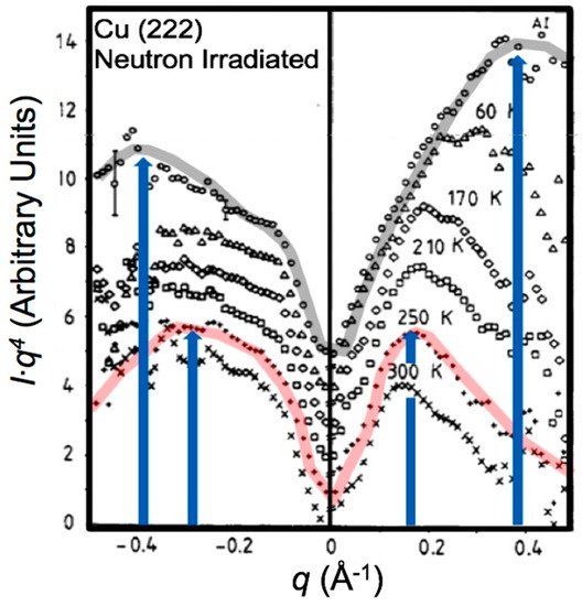 20] used X-ray diffuse scattering to investigate defect clusters in gamma-irradiated alkali halides, and also the structure of point defects and small clusters in displacement cascades produced during liquid-helium-temperature neutron irradiation of metals. These theoretical and experimental diffuse scattering investigations of the structure of single interstitials were successful in their aim; they determined unambiguously the crystallographic structure of interstitials in face-centered cubic metals to be <100> dumbbells. In the process of investigating the clustering of interstitials during warm-up from liquid helium temperature, they analyzed the diffuse scattering shape changes to determine the characteristic size of interstitial clusters by making use of the cutoff (