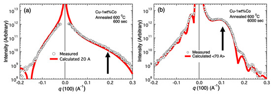Figure 10 shows measurements performed near the (400) Bragg reflection on Cu-1wt%Co single crystals that were aged at 873 K for 600 s and 6000 s following a high-temperature pre-anneal to dissolve the Co into solution. The thick red lines represent diffuse scattering calculations using parameters corresponding to