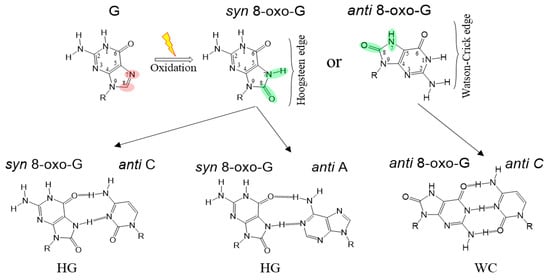 Of all nucleobases, guanine has the lowest reduction potential and is the most vulnerable to ROS [1,2,3,4,5]. Among hundreds of oxidative stress-induced DNA lesions, 7,8-dihydro-8-oxo-2′-deoxyguanine (oxoG) is one of the most abundant [6] (Figure 1). It can be generated by singlet oxygen (1O2, the electronically excited state of molecular oxygen which reacts preferentially with electron-rich G residues) [7] as well as by HO• and alkylperoxyl radicals [8]. Intermediates in reactions with purines induced by radicals (but not by singlet oxygen) can also be reduced, producing a series of formamidopyrimidine lesions [8,9]. OxoG can be formed both by direct oxidation of G base in DNA and by oxidation of dGTP or GTP in the nucleotide pool. It is estimated that in vivo 1–2 × 103 oxoG lesions form daily in a single normal human cell, and this rate could allegedly rise to 105 in cancer cells [10,11,12,13,14]. The steady state level of oxoG in repair-proficient mammalian cells is about 0.3–4.2 per 106 normal guanines [15,16]. Levels of oxoG are often used as a biomarker of oxidative damage and are considered a risk factor for degenerative diseases and cancer [17,18].