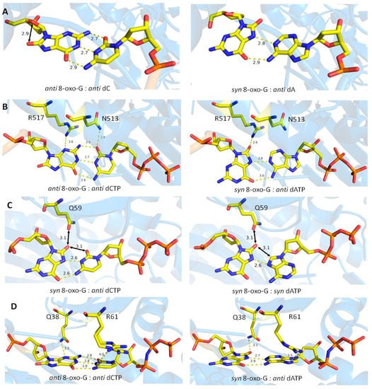 Pol β and Pol λ are among few polymerases for which incorporation of oxodGMP has been structurally characterized [262,263,264,265]. These structures illuminate general principles of non-mutagenic and mutagenic oxodGMP insertion and extension. In the structures with the incoming oxodGTP in a precatalytic state, the damaged dNTP adopts the syn conformation and forms a Hoogsteen pair with A in the template.