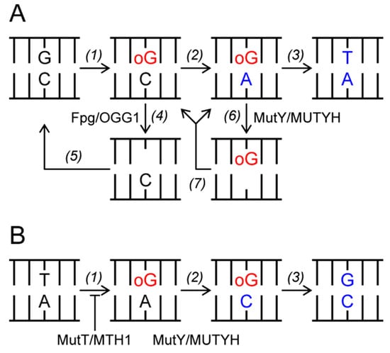 OxoG-induced mutagenesis and the GO system. (A) oxoG can appear in DNA through oxidation of G (1) and direct misinsertion of A during replication (2); if not repaired, oxoG:A mispair produces T:A after the second round of replication. OxoG can be removed by Fpg/OGG1 from oxoG:C before the replication (4) and the subsequent BER steps restore the G:C pair (5). Alternatively, after the replication, A can be removed from oxoG:A (6) allowing the repair DNA polymerases to insert either C or A opposite to oxoG (7). (B) oxoG can also appear in DNA through incorporation from oxodGTP. If this occurs opposite to A (1), the repair by MutY/MUTYH (2) is mutagenic, causing a T:A-to-G:C transversion (3). MutT/MTH1 hydrolyzes oxodGTP and intercepts this pathway at the beginning.