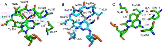 The structures of Fpg from E. coli [99], Thermus thermophilus [100], Lactococcus lactis [101], and G. stearothermophilus [102] defined a novel structural superfamily characterized by the presence of two conserved DNA-binding motifs, the helix–two-turn–helix (H2TH) motif and a single Cys4 β-hairpin zinc finger (some eukaryotic homologs possess a “zincless finger”, a structurally identical hairpin lacking the zinc binding site). As most other DNA glycosylases, Fpg flips the damaged nucleotide out of the helix and binds it in a dedicated lesion-recognition pocket. Unfortunately, this pocket is disordered in many Fpg–DNA crystals that lack the damaged base, so only a few structures are available to analyze the determinants of oxoG specificity, and even these are discordant. Several G. stearothermophilus Fpg structures were solved using a catalytically inactive E2Q mutant [103,104,105], showing oxoG in the syn orientation, with a 220TVRTY224 loop encircling O6 of oxoG and forming a “crown” of four main chain amines, any two of which can donate hydrogen bonds to O6. The Watson–Crick edge of oxoG is additionally locked in place by Oγ[Thr223]…N1[oxoG], N2[oxoG]…Oγ[Thr223], and N2[oxoG]…Oε2[Glu77] hydrogen bonds. The damaged base selectivity is provided by the oxoG pyrrolic N7 donating a hydrogen bond to Ser219 main-chain carbonyl, whereas O8 does not appreciably contribute to interactions distinguishing G from oxoG (Figure 4A). Surprisingly, in the crystals of wild-type L. lactis Fpg bound to DNA containing 1′–4′-carba-FapyG or N5-benzyl-1′–4′-carba-FapyG, which are uncleavable due to a methylene group substituting for O4′, the damaged base is rotated almost 180°, residing in the anti-orientation [106,107] (Figure 4B). Even more surprisingly, the crown around O6 is formed by the homologous loop both in the syn and the anti-orientation [106,108]. Yet another orientation, in the middle of the syn range and almost orthogonal to those discussed above, is observed in L. lactis Fpg bound to DNA containing 1′–4′-carba-oxoG [109]. Here, the distinguishing interaction seems to be the N[Pro1]…O8[oxoG] hydrogen bond, and O6 is not fixed.