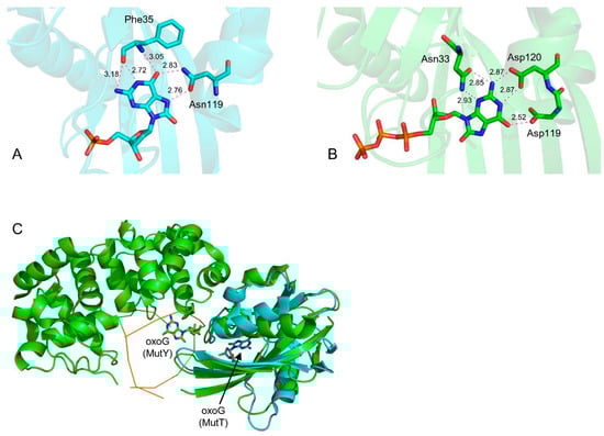 The structure of E. coli MutT was determined both by X-ray crystallography and by NMR, but there is a large discrepancy between these data regarding the binding site for oxoG in the structure of MutT. According to the crystal structure of E. coli MutT bound to oxodGMP [158], the damaged nucleotide is bound in the syn conformation in a deep pocket inside the protein, with oxoG specifically recognized by the Asn119 side chain forming bonds to N7 and O6 (Figure 5A). The Watson–Crick edge of oxoG is locked in place by the main chain amide and carbonyl of Phe35 engaging O6, N1, and N2. The catalytic divalent cation (Mn2+ in the structure) is coordinated by the Gly37 main-chain carbonyl, Glu56 side-chain carboxyl, and the α phosphate. In the structure of a MutT homolog from Rhodospirillum rubrum in a complex with ADP (PDB ID 3R03, unpublished), the syn nucleoside is bound in the same pocket but is not inserted as deeply as oxodGMP in E. coli structures. In contrast, four sets of conformers of MutT/oxodGMP identified by NMR [159] map the oxidized nucleotide loosely bound at different places at the surface, with scarce interactions with the enzyme; a similar situation is observed with α,β-methylene-ATP as a ligand [160]. The much better nucleotide coordination and the similarity with the structure of the human enzyme (see below) indicate that the crystal structure but not the NMR structures faithfully describes the MutT/substrate complex. Molecular dynamics studies [161] suggest that the high specificity of MutT for the damaged dNTP (ksp oxoG/ksp G ~6000 [162]) is partially due to a change in the enzyme conformation upon substrate binding that is more favorable for oxodGTP than for dGTP.
