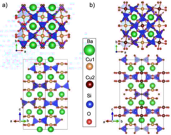 - Sparta, K.M.; Roth, G. Reinvestigation of the structure of BaCuSi2O6—Evidence for a phase transition at high temperature. Acta Crystallogr. Sect. B Struct. Sci. 2004, 60, 491–495. [Google Scholar] [CrossRef] [PubMed]