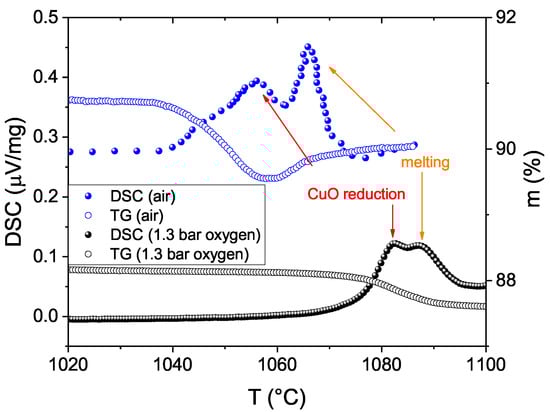 We performed differential scanning calorimetry (DSC), including a thermogravimetric (TG) analysis, on the growth conditions of BaSrCuSiO and observed the reduction of Cu to Cu while releasing oxygen (2CuO⟶ CuO + O) monitored by a mass loss in the TG signal, followed directly by the melting of the compound. Afterwards, the melting turns it to a viscous mass that glazes when cooled in air. However, upon applying oxygen pressure, the decomposition is shifted up further than the melting temperature seen in a DSC experiment performed in air compared to one in oxygen flow with a partial pressure of 1.3 bar [13] (see Figure 2). Using a linear interpolation, the difference between decomposition and melting would meet at around 2 bar. Thusm one would expect optimal growth conditions above this oxygen pressure.