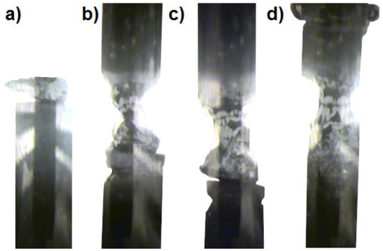 Surprisingly, an increase of pressure with attempts at 0.5, 1, 2.5, 3, 4, 5, and 7 bar led to similar problems and could not stabilize the melt and suppress the bubble formation (C2,3). In all cases, when changing the lamp power by a few percentage points, the melt was either too viscous at low lamp power or the temperature was too high, leading to a decomposition. This implies that the decomposition and melting point are still overlapping, as seen in the DSC curve. As CuO can only be grown at elevated oxygen pressures [14,15], we wanted to attempt even higher pressures to ensure a clear separation of the CuO reduction and melting point following an extrapolation of Figure 2. Even upon application of 100 bar of oxygen pressure (using FZ2), we were still unable to stabilize the liquid zone (C4). Repeated disconnection complicated the growth attempt, and afterwards, we could still find orange parts of reduced copper oxide on crushed pieces of the obtained crystal. Thus, in order to find stable growth conditions with FZ1, the experience of applying an oxygen–argon mixture in the comparable compound of SrCu(BO) [16,17] was used. Varying the pressure and oxygen/argon mixture leads to a liquidification of the melt and a breaking of the bubbles into smaller, not visible, ones with increasing argon content, which stabilizes the growth conditions. We found that the concentration of argon has to exceed the oxygen one for this effect. Nevertheless, in a cross section of obtained multigrain crystals, there is still some orange CuO phase present, proving the continuation of a decomposition at any attempted pressure and mixture of gases. Without the possibility of a full suppression of the CuO reduction, we studied the growth in stable conditions using four 300 W lamps operated at 54.5% with 5 bar pressure obtained with 0.4 L/min argon and 0.1 L/min oxygen gas-flow: Only in the case of several simultaneously growing grains is the CuO impurity incorporated in between the grains, while with a single grain, the impurity is pushed up with the liquid zone until the very last part of the melt. Thus, the orange CuO is kept in the molten zone without any influence on the single crystal formation.