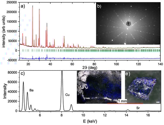 (a) Rietveld refinement of the crystal structure parameters of BaSrCuSiO crushed single crystals, based on laboratory X-ray powder diffraction data at 295 K. The rows of ticks in the middle correspond to the calculated diffraction peak positions of the structure. (b) Laue image on the shiny side of the single crystal shown in Figure 5b revealing the c-axis of the tetragonal system. (c) MicroXRF spectra of the BaSrCuSiO single crystal C8. (d) Magnified image of a section from the FZ crystal C8 (e) Broken piece of an FZ grown crystal solely in oxygen atmosphere C2.