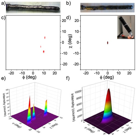 BaSrCuSiO crystals cleave well perpendicular to the c-direction, leaving shiny ab-planes enabling an easy orientation when breaking off the last and first part of the growth. Obtained BaSrCuSiO crystals were analyzed in a neutron scattering experiment using the MORPHEUS 2-axis diffractometer at SINQ (PSI) at room temperature with a wavelength of 5 Å (see Figure 5c–f). We scanned one reflection by fixing the detector to, e.g., 53.34° for the (0 0 4) reflection shown in Figure 5 and measured while rotating the crystal to search for additional grains. As discussed above, this neutron diffraction measurement revealed that earlier growth attempts with 1 mm/h gave rise to three grains developing rather equally throughout the rod. They are slightly tilted in the ab-plane in respect of each other but share a similar c-axis orientation perpendicular to the growth direction (see Figure 5c,e).