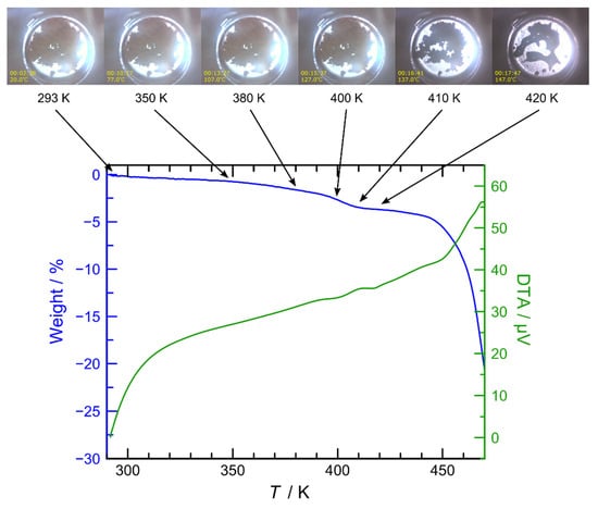 TG/DTA curve of 1 with the selected real-time sample images (from 293 to 420 K) during the TG measurement.