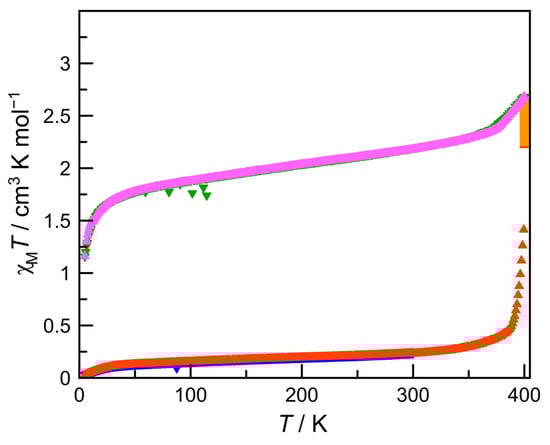 Temperature dependence of the χMT product for 1 at a sweep rate of 2 K min−1. The sample was cooled from 300 to 5 K (blue inverted triangles) and then warmed from 5 to 400 K (red triangles) in the first cycle, and the temperature was held at 400 K for 30 min (orange triangles), and then the sample was cooled from 400 to 5 K (green inverted triangles) and then warmed from 5 to 400 K (magenta triangles) in the second cycle.