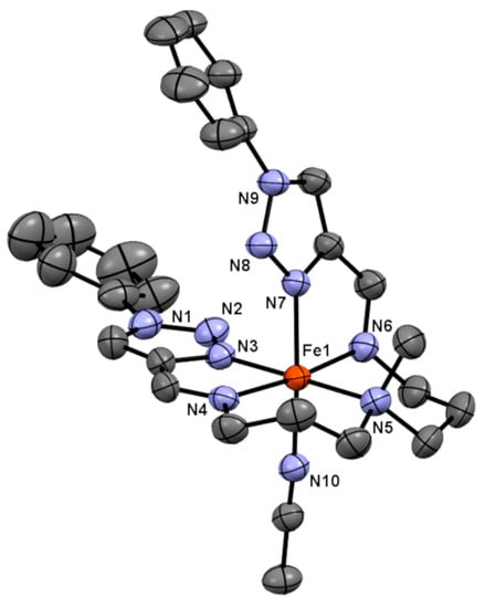 Octahedral metal complexes with pentadentate ligand are of interest since their ligand field strength can be systematically controlled by modifying the additional monodentate ligand in line with the spectrochemical series [30,31,32], and such a characteristic is useful not only for exhibiting SCO but also for the possible tuning of T1/2. These complexes are also beneficial for the construction of polynuclear materials such as di [33,34,35,36,37,38,39,40,41,42], tri [43], tetra [44], penta [45], hepta [46,47,48], nona [48] and dodecanuclear [49] complexes by using bridging ligands instead of monodentate ligands for exhibiting multi-step spin transition. In the pentadentate ligand system, although iron(III) SCO compounds are well known [50,51,52,53,54,55,56,57], iron(II) spin transition systems are quite rare [58,59]. One of the reasons for this is the difficulty of the crystallization of iron(II) complexes with pentadentate ligand, as pointed out by Matsumoto et al. [60]. To the best of our knowledge, only one SCO iron(II) complex with linear pentadentate ligand, which shows the gradual and partial SCO below RT, has been reported so far [59]. So, our ongoing interest for exploring RT and HT SCO systems by using 1,2,3-triazole-containing multidentate Schiff-base ligands spontaneously extends to the next project for the synthesis of a SCO iron(II) complex bearing linear pentadentate ligand, which is missing in our tridentate to hexadentate ligand family [15,18,26,61,62,63].