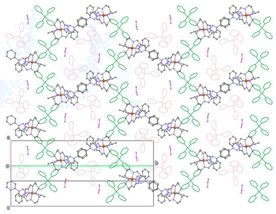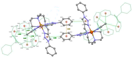 Figure 4 shows the selected intermolecular interactions of 1 at 296 K. Firstly, the MeCN ligand of the complex-cation is surrounded by four nearest phenyl rings of two B(1)Ph4− ions via CH···π interactions between the methyl group of the MeCN ligand and phenyl groups of B(1)Ph4− ions with the C27 (Me) to centroid (Ph) distances being in the range of 3.567–3.788 Å. Since the three hydrogen atoms of the methyl group of the MeCN can form only three CH···π interactions, the four CH···π interactions of each MeCN indicated in Figure 4 are averaged as one. Secondly, two neighboring complex-cations are connected by a P4AE (parallel fourfold aryl embrace) interaction [28,89], forming a dimeric structure with the C23 (Ph) to centroid (triazole) distance of CH···π and centroid (Ph) to centroid (Ph) distance of π–π interactions are 3.690 and 3.663 Å, respectively. As a result, a 1D chain structure is constructed by alternately interacted complex-cations and B(1)Ph4− ions via CH···π interactions (longitudinal direction in Figure 5), and further connections of the 1D chains through P4AE interactions (transverse direction in Figure 5) form a 2D extended layer structure. The remaining B(2)Ph4− ions and MeCN lattice solvents exist in the spaces of the 2D layer with the intermolecular CH···N interaction (C61···N11 = 3.486 Å). Finally, there are additional CH···π interactions between the layers, resulting in the construction of a 3D supramolecular network in the whole crystal lattice. This molecular assembly is quite different from the tetrameric assembly through four intermolecular NH···Cl interactions of 2 [59]. Therefore, this difference of molecular assembly is presumably responsible for the emergence of different SCO profiles between 1 and 2.