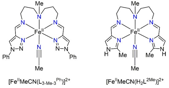 Schematic structures of [FeIIMeCN(L3-Me-3Ph)]2+ and [FeIIMeCN(H2L2Me)]2+.