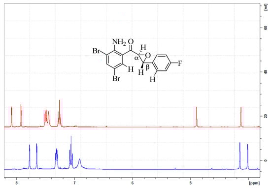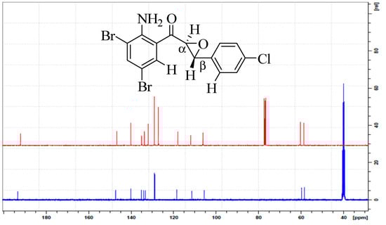 The 2-amino-3,5-dibromochalcones 1a–c were reacted with hydrogen peroxide in the presence of sodium hydroxide in methanol at room temperature (RT) for 6 h to afford the corresponding 2-aminochalcone epoxides 2a–c (Scheme 1). Structural information on the α-epoxyketones 2 in solution were obtained from 1D- and 2D-NMR studies. Their 1H-NMR spectra were recorded in CDCl3 and DMSO-d6 to investigate solvent effects (Figure 1). The 1H-NMR spectra of these epoxides obtained as CDCl3 solutions revealed the presence of a group of signals in the aromatic region and a broad singlet (br s) with chemical shift (δ) value around 7.00 ppm for the amino group (Figure 1, bottom spectrum in blue). The signal for -NH2 resonated as a relatively intense singlet slightly downfield in the region δ = 7.45–7.49 ppm in DMSO-d6 (Figure 1, top spectrum in red). The aliphatic region of their spectra in CDCl3 revealed the presence of a set of doublets around δ 4.06 ppm and δ 4.20 ppm with coupling constant (3Jvic) value of about 2.0 Hz. This small 3JHH value is typical for the trans-stereochemistry of relatively rigid 3-membered ring systems (Jcis > Jtrans) [] and compares favourably with the literature value for the trans-2-benzylaminochalcone epoxides [] and the analogous 2-aminochalcone epoxides []. The set of doublet of doublets corresponded to α-hydrogen and β-hydrogen atoms, and their corresponding carbon atom signals resonated at δ 57.9 ppm (β-C) and δ 59.0 ppm (α-C), respectively. The doublet for the α-hydrogen resonated slightly upfield around δ 4.06 ppm in CDCl3, but showed an anomalous downfield shift to around δ 4.86–4.89 ppm in DMSO-d6. This is presumably due to dipole–dipole interaction of DMSO with the carbonyl group oxygen and the β-carbon. A similar effect by DMSO on the α-hydrogen has previously been proposed for the phenyl vinyl ketones []. Such interaction in the case of the title compounds would probably fix the trans conformation of the α-epoxyketone and, in turn, make the α-hydrogen more accessible to both aryl groups to experience their combined magnetic anisotropy. In our view, solute–solvent interaction together with the combined magnetic anisotropic effect of the two phenyl groups contributed significantly to the anomalous solvent effect on the chemical shift of the α-hydrogen. On the other hand, solute–solvent interaction showed no effect on the chemical shift of the β-hydrogen in DMSO-d6.