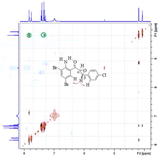 The trans orientation of the α- and β-hydrogens about the epoxide ring was further confirmed by lack of correlation of their corresponding signals in the 2D NOESY spectra of compounds 2a–c, represented in Figure 2 by the spectrum of 2c (the NOESY spectra of 2a and 2b have been included as Figure S2 in the Supplementary Materials). The 2D NOESY experiments revealed a strong NOE correlation peak between a doublet around δ 4.20 ppm with a doublet for H-6 on ring-A and the hydrogen atom on ring-B (either H-2′ or H-6′) ortho to the β-carbon (see structure insert in Figure 2). The other doublet of the epoxide ring, which was assigned to the α-hydrogen atom, resonated slightly upfield around δ = 4.06 ppm and showed no interaction with any of ring-A or ring-B protons. The NOE correlation between the signal around δ 4.20 ppm with H-6 and an ortho hydrogen atom on ring-B (ortho relative to the β-carbon) presumably suggests these protons to be on the same face of the epoxide ring. Moreover, this orientation further confirms the trans stereochemistry of the α-epoxyketone moiety. Based on the observed vicinal diaxial coupling constant value (Jvic) of 2.0 Hz and lack of correlation between signals of the α-H and β-H in the NOESY spectrum (refer to Figure 2 below and/or Figure S2 in the Supplementary Materials), we concluded that these α-epoxyketones existed exclusively in solution as the trans-conformers. This conformation would probably enable intramolecular hydrogen bond interaction between the carbonyl oxygen and hydrogen atoms of the amino group. In our view, the involvement of NH function in a six-membered intramolecular hydrogen bonding was confirmed by the lack of H/D exchange in DMSO-d6 for all the compounds and by the slight increase in chemical shift (δ) of about 0.45 ppm in this solvent from around δ 7.00 ppm in CDCl3. This intramolecular hydrogen bonding interaction appeared to be stable in both solvents without disruption by H/D exchange or rotation about the Ar–NH2 bond.