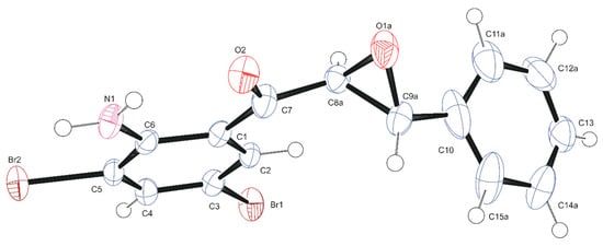 Intensity data were determined on a Bruker Venture D8 Photon CMOS diffractometer (Bruker AXS, Madison, WI, USA) with graphite-monochromated MoKα1 (λ = 0.71073 Å) radiation at 173 K using an Oxford Cryostream 600 cooler. Data reduction was performed using the program SAINT+, version 6.02 []. Face-indexed absorption corrections were performed with SADABS []. The space group assignments were made using XPREP []. The structure was solved in the WinGX [] Suite of programs using direct methods through using SHELXS-97 [], and refined using full-matrix least-squares/difference Fourier techniques on F2 using SHELXL-2017 []. All hydrogen atoms were placed at idealized positions and refined as riding atoms with isotropic parameters 1.2 times those of their parent atoms. The disorder around epoxide group C8–O1–C9 was resolved by finding alternate positions in the difference Fourier map and by refining their occupancies to final values of 0.578(8) and 0.422(8). The disorder around the phenyl ring of atoms C11, C12, C14 and C15 was resolved by finding alternative positions in the difference Fourier map and refining their occupancies to final values of 0.536(7) and 0.464(7). Diagrams and publication material were generated using ORTEP-3 [] and PLATON [].