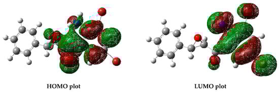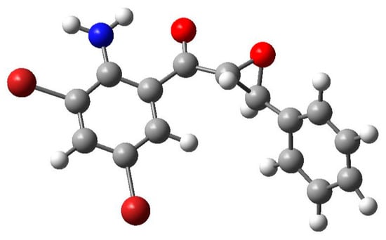 The difference in energy between the HOMO (highest occupied molecular orbital) and LUMO (lowest unoccupied molecular orbital) is an important quantitative structure–activity relationship (QSAR) descriptor and has also been found to relate to molecular reactivity []. The electron distribution of 2a was scattered in the HOMO over the epoxy ortho-aminoketoaryl moiety excluding the bromine atoms, whereas the LUMO was mainly disseminated over the entire ortho-aminoketoaryl group (Figure 9). The frontier molecular orbital energy gap between the HOMO (−0.229 eV) and the LUMO (−0.089 eV) of 2a was found to be 0.14 eV. This high energy gap value may suggest high chemical stability and high excitation energy for this molecule.