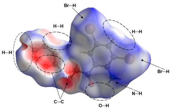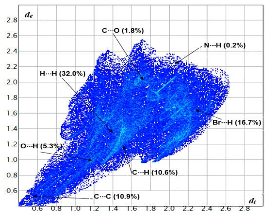 The Hirshfeld surfaces and their associated two-dimensional (2D) fingerprint plots for compound 2a were computed based on the single-crystal X-ray structure as input. The quantifying and decoding of the inter-contact in the crystal packing were visualized using dnorm (normalized contact distance) and 2D fingerprint plots, respectively. The red spots over the HF surface indicate the interactions that involve hydrogen bonding (Figure 7) and analysis of the surface confirmed H-bonds and π–π stack interactions obtained by XRD packing analyses. The major contributions on the HF surface were from H···H (32.0%), Br···H (16.7%), C···H (10.6%), C···C (10.9%), O···H (5.3%), C···O (1.8%) and N···H (0.2%), as represented in Figure 8 below.